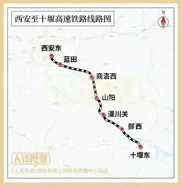 全线设西安东、蓝田、商洛西、山阳、漫川关、郧西、十堰东(既有运营)7座车站,建成后将接入已通车的汉十高铁,形成西安至武汉的快速铁路客运通道,进一步优化全国高铁路网结构。